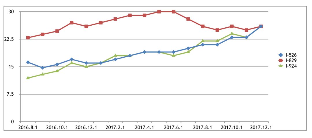 3. 比起11月份,12月份的審批進度全面後退,I-526後退二月,I-829後退半月,I-924後退一個半月;